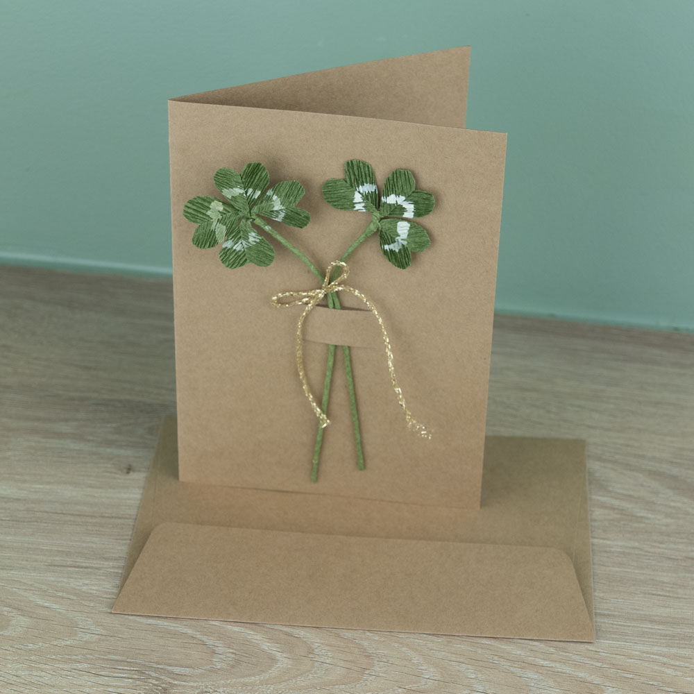 Faites passer vos messages avec style et émotion grâce à nos cartes. Chaque carte est ornée d’un trèfle porte-bonheur à quatre feuilles et un trèfle à trois feuilles en papier crépon, soigneusement façonnés et teintés à la main.