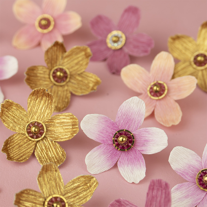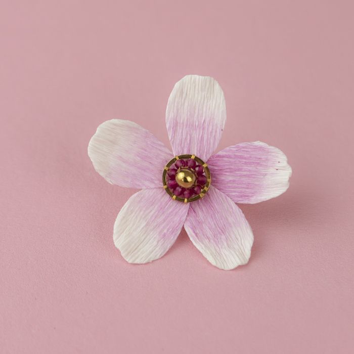 Ce pin’s inspiré du Sakura est le fruit d’une collaboration avec la créatrice de bijoux Cristina Lopez. Il associe un travail précis du papier crépon à une finition soignée issue de la bijouterie.