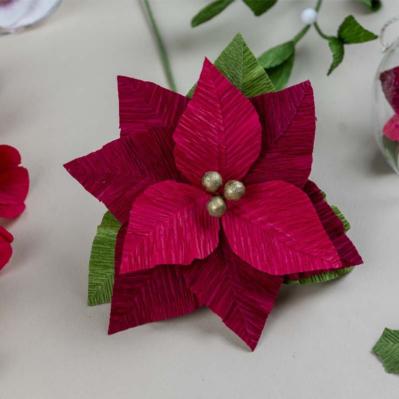 Cette fleur de poinsettia en papier crépon est un hommage sobre et délicat à la fleur emblématique de Noël. Réalisée à la main, elle présente des pétales aux nuances profondes de rouge et un cœur orné de trois petites baies dorées.
